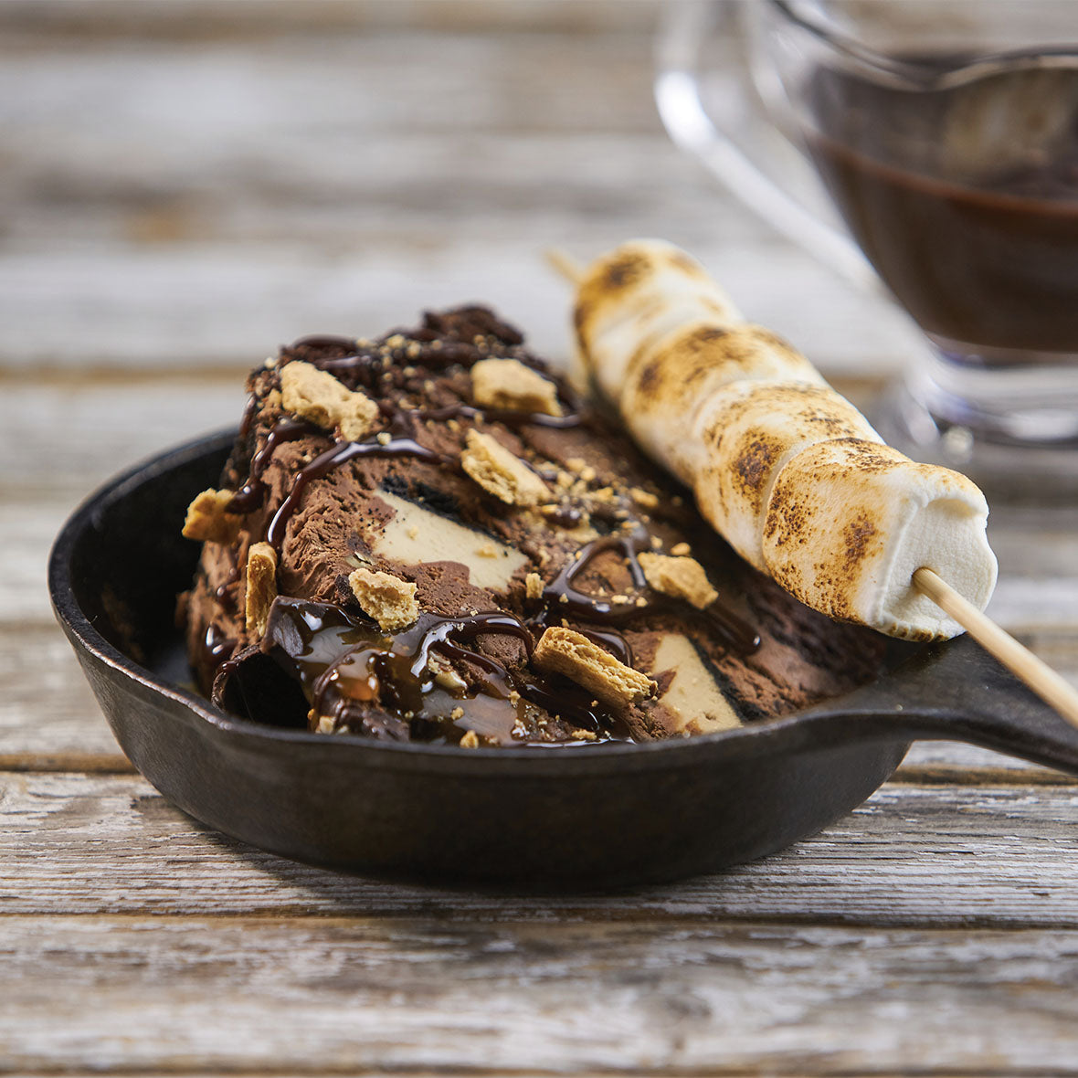 A decadent chocolate cake shell cradles a molten eruption of chocolate mousse, studded with crunchy nuts, rich chocolate chips, and indulgent turtle cheesecake cubes. Finished with a flourish of chocolate curls, toasted almonds, and a cascade of golden caramel from its ooey-gooey center—it’s an unforgettable dessert experience that dares to go all in.