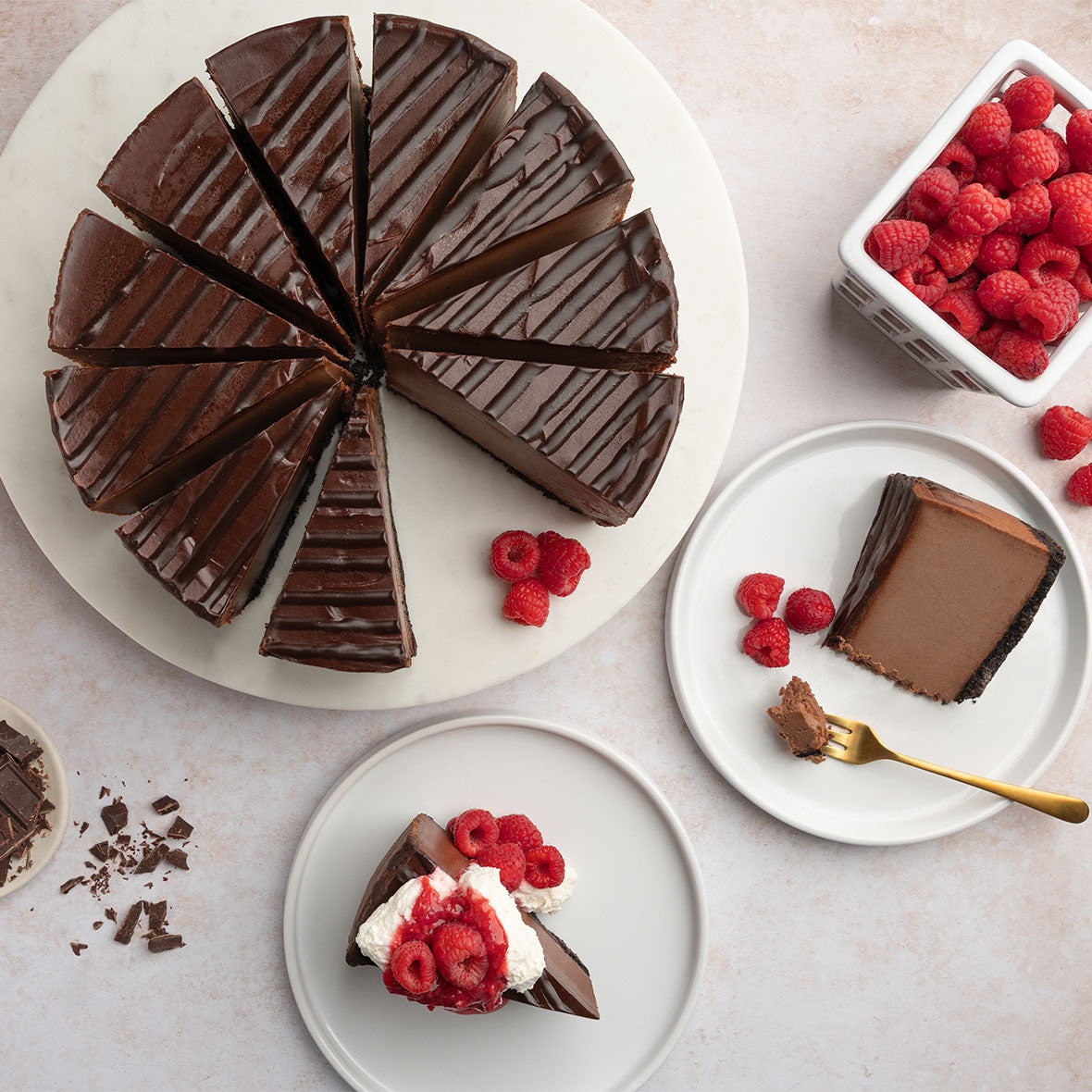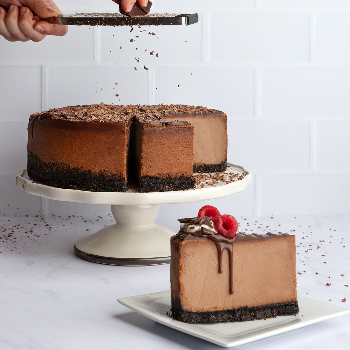 An exquisite indulgence crafted from fresh, thoughtfully sourced ingredients. This impressive chocolate cheesecake layers luscious Belgian chocolate filling over an irresistible dark chocolate cookie crust, crowned elegantly with velvety ganache, and artfully adorned with delicate chocolate drizzle.