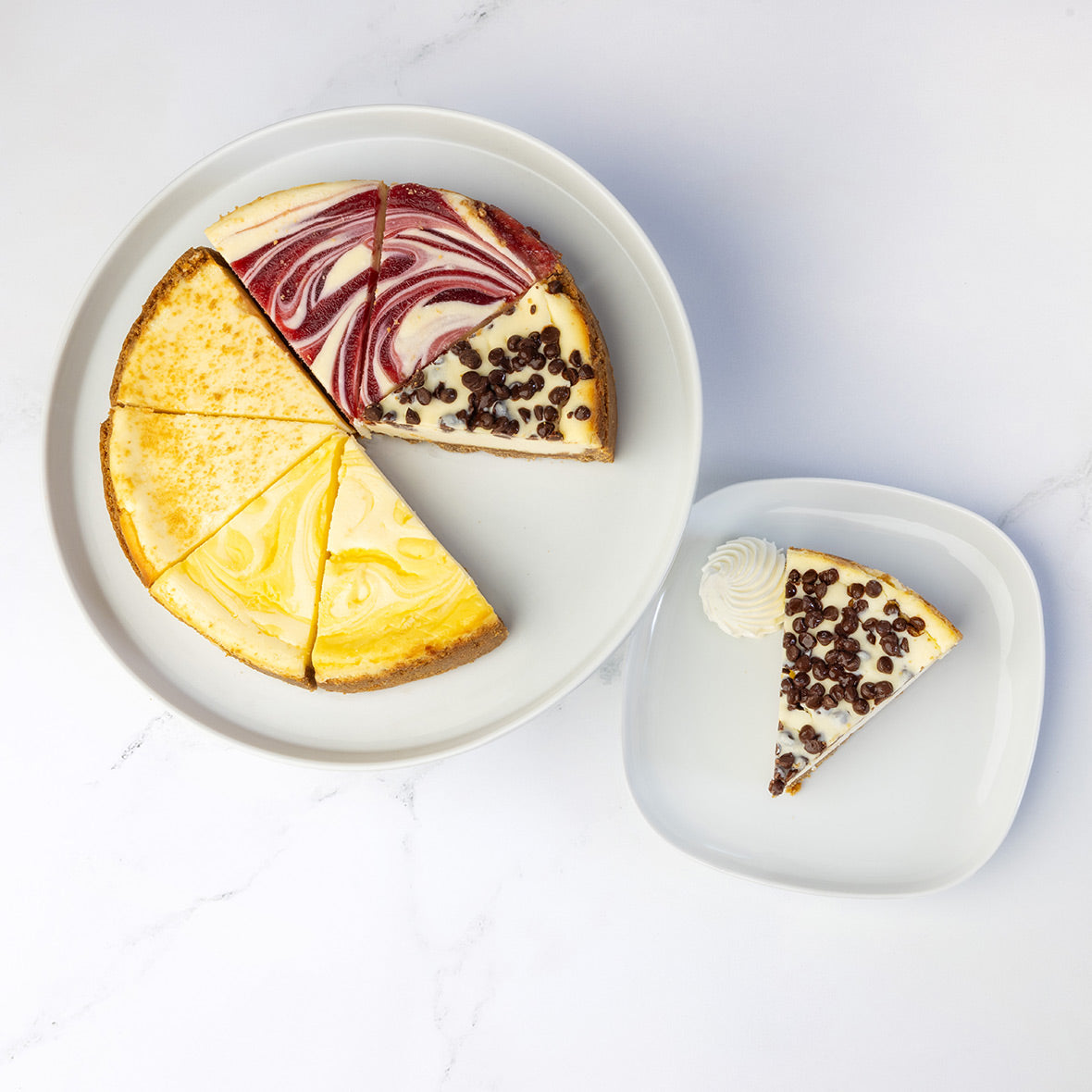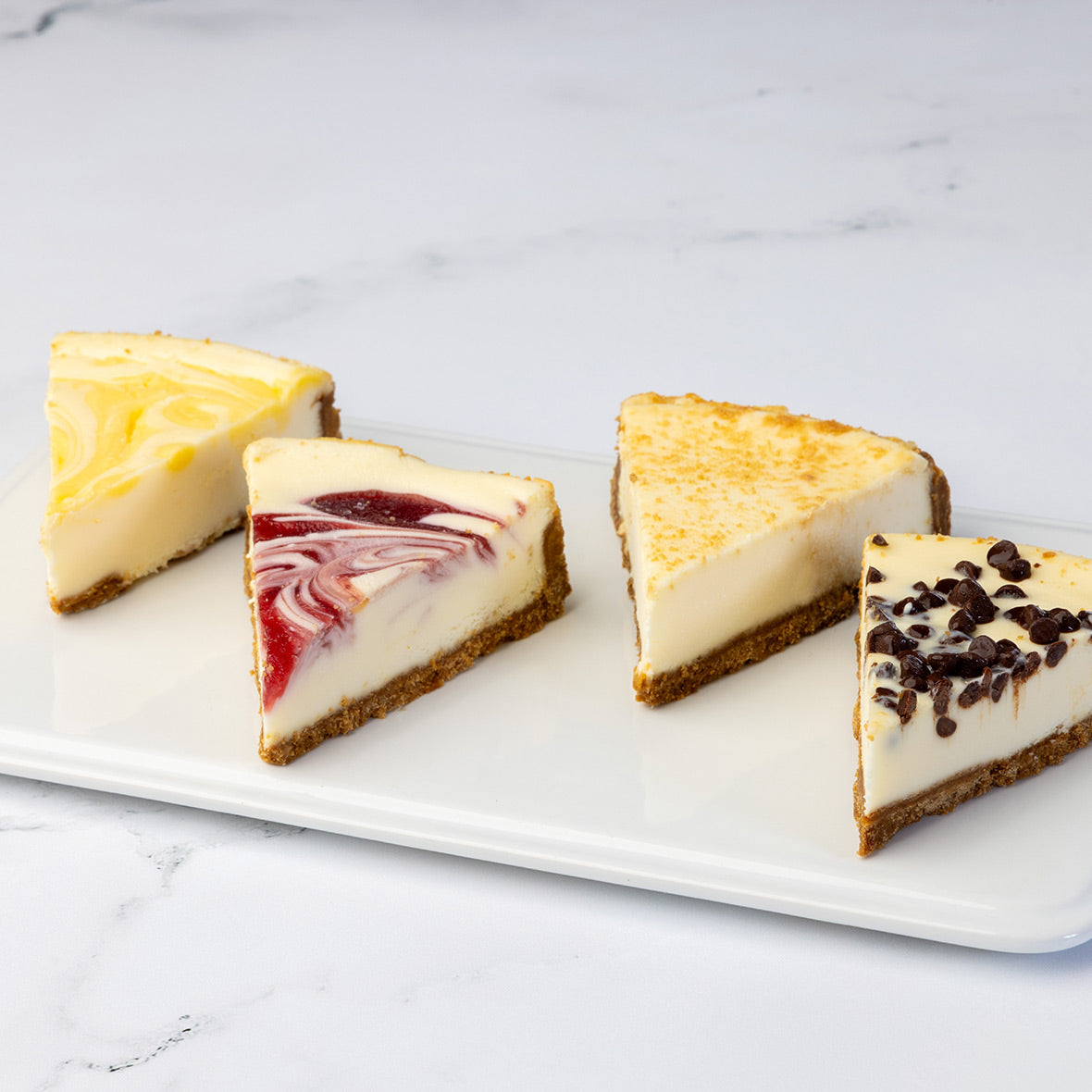 Enjoy a crave-worthy variety of our gluten-free cheesecake favorites with two slices each of New York, Strawberry Swirl, Lemon Swirl, and Chocolate Chip. Crafted without compromise, every slice delivers rich, creamy indulgence with all the flavor and none of the gluten.