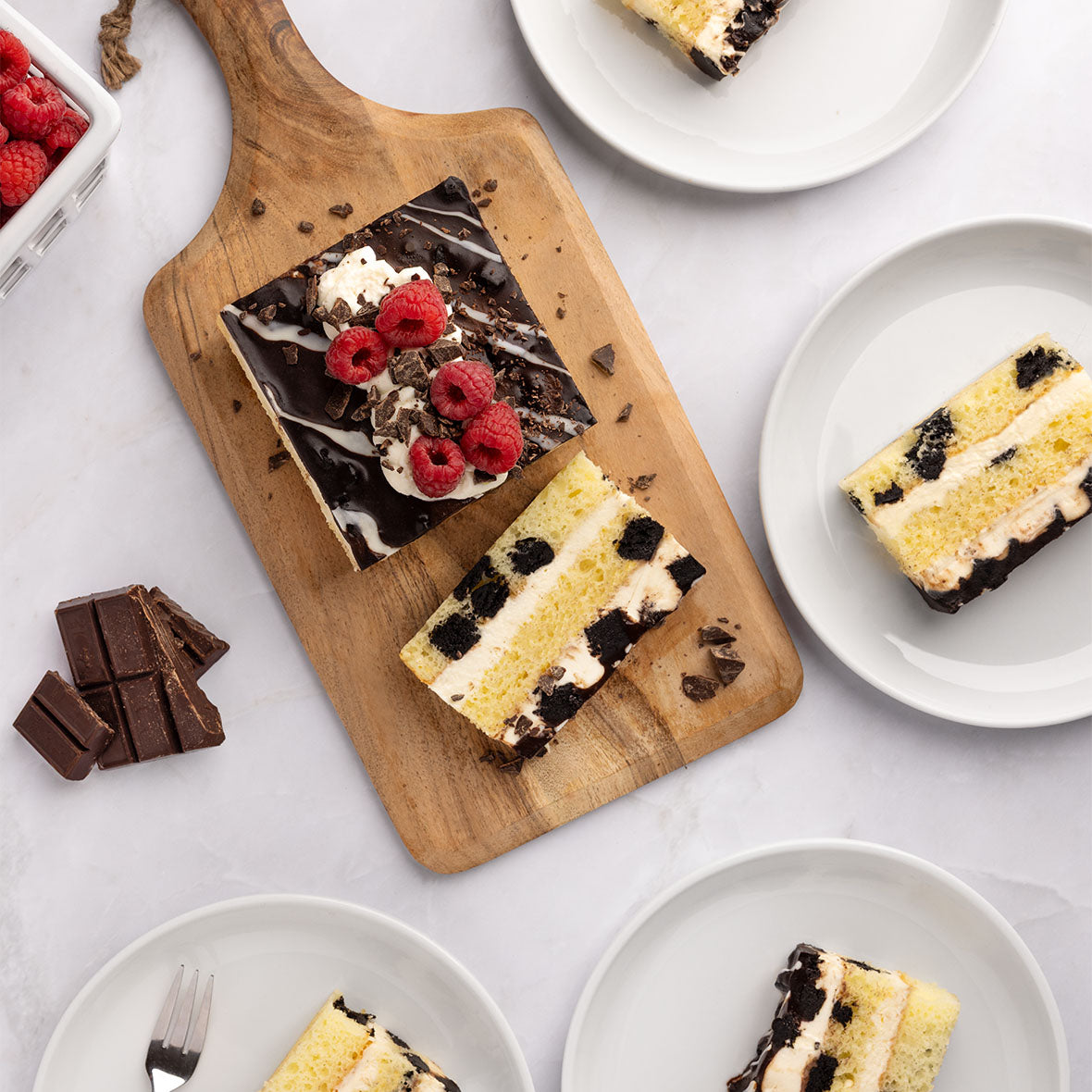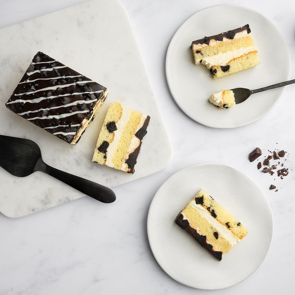 A nostalgic treat that brings everyone to the table. Our premium Gluten-Free sponge cake is studded with chewy cookie pieces and filled with creamy layers of vanilla cream mousse. It’s finished with smooth dark chocolate ganache and an artful white chocolate drizzle.