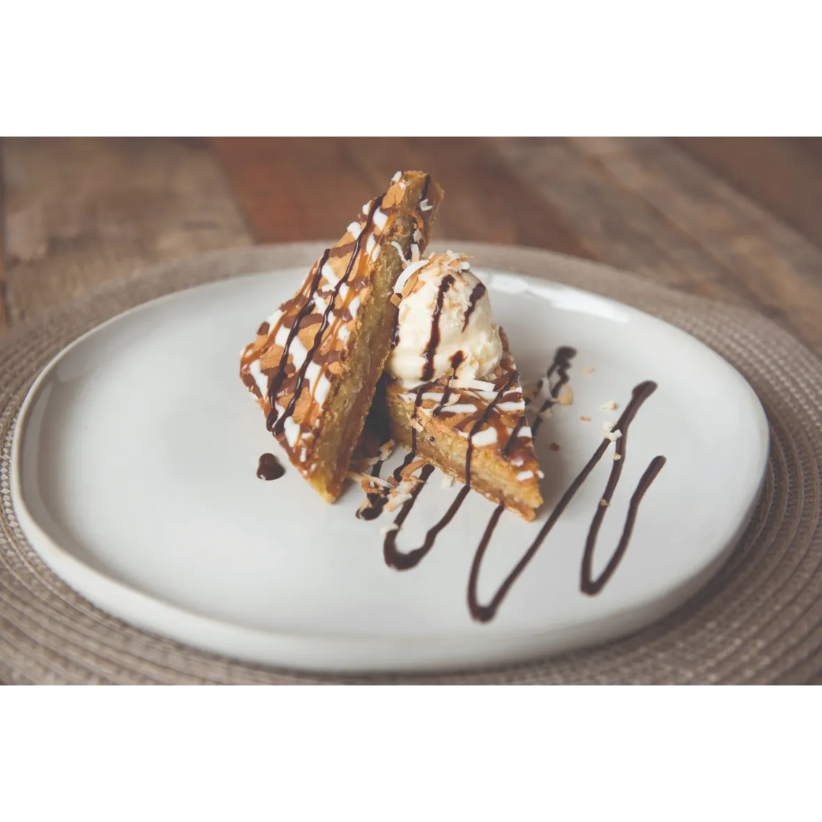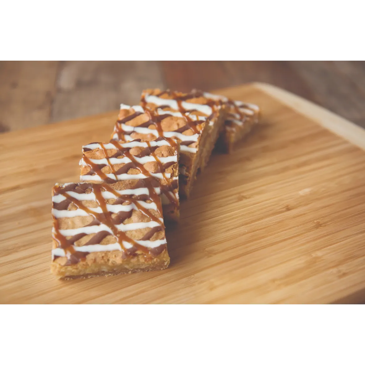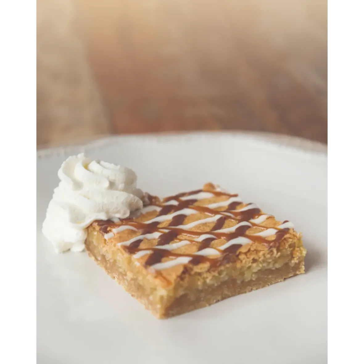 Enjoy a coconut walnut shortbread base, topped with caramel macaroon filling, and finished with chocolate and caramel drizzles.